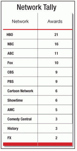 While HBO led the Emmy tally, it did so without winning any major awards Sunday for series such as "Big Love," "Entourage" or "True Blood."