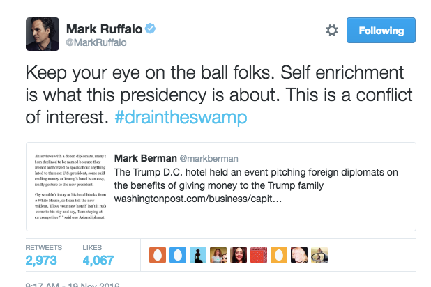 Ruffalo urged his Twitter followers to “keep your eye on the ball” when it comes to Trump, warning them not to get distracted by the president-elect’s bombastic tweets.