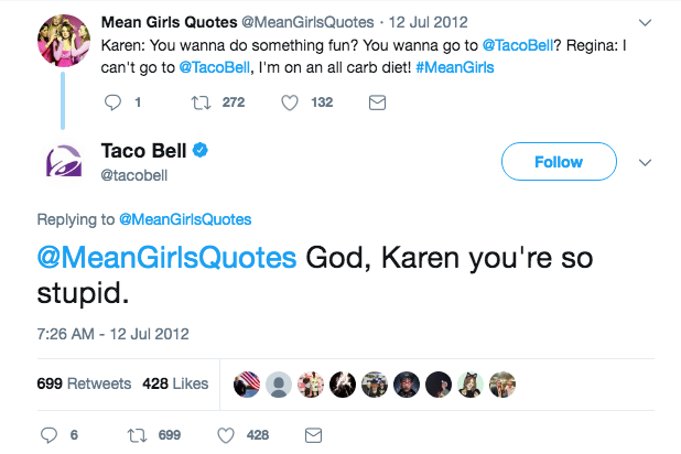 In fact, Taco Bell might well be the champion of Twitter burns, as exemplified by the company’s knowledge of “Mean Girls” to come up with the best response.