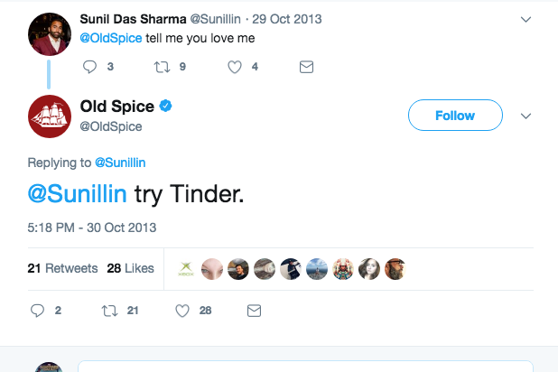 “[T]ell me you love me,” one Twitter user asked Old Spice. Understandably, Old Spice recommended another avenue.