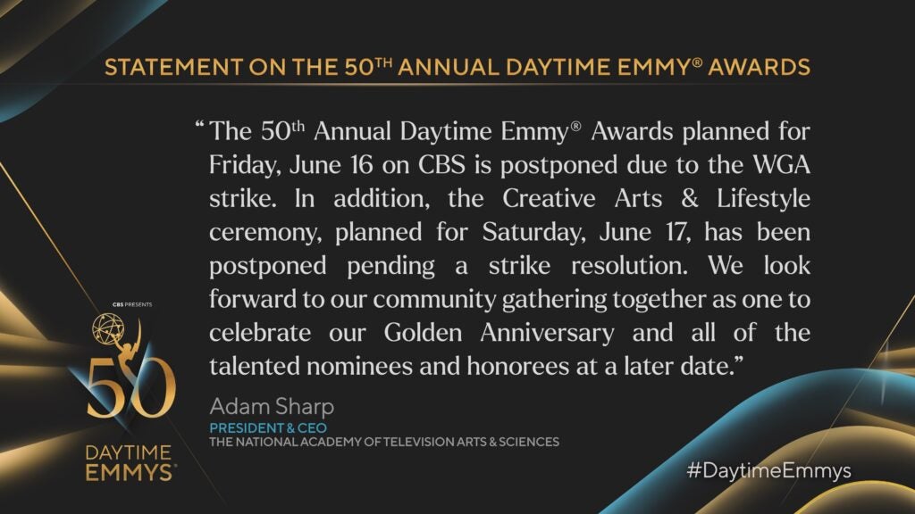 The 50th Annual Daytime Emmys will be postponed due to the WGA Strike, Adam Sharp, president and CEO of the National Academy of Television Arts & Sciences announced on Tuesday.