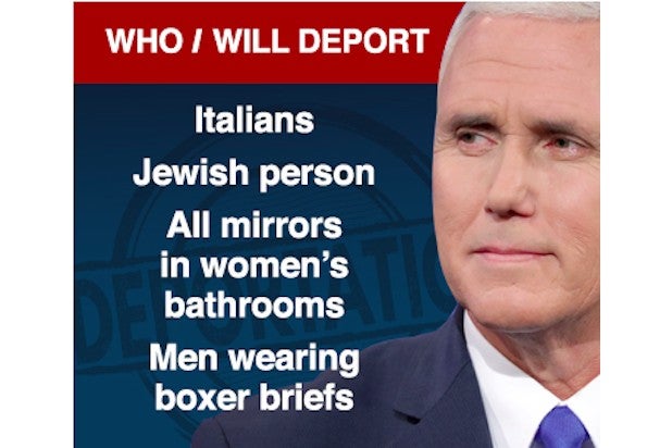 As President, Pence promises to deport “Italians, Jewish Persons, All mirrors in women’s bathrooms, and men wearing boxer briefs.”