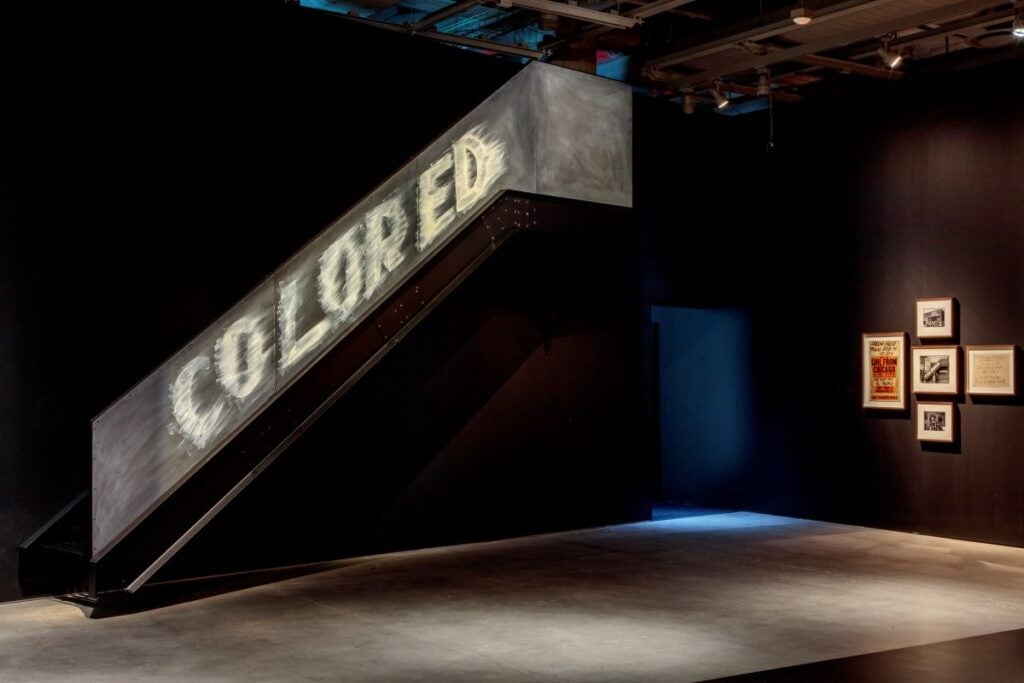 But for all of the celebration of the forgotten ingenuity of early Black cinema, “Regeneration” doesn’t ignore the very real limitations placed on these performers. A contemporary art piece by Gary Simmons called “Balcony Seating Only” shows a black staircase with the word “colored” roughly painted in white, alluding to the racially segregated seating sections at cinemas in the Jim Crow era.