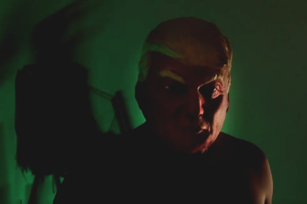 Throughout the credits, two characters put on the masks. In one shot, a man puts on a Trump mask in front of a mirror and then looks at the camera. The shot is immediately followed by a brief glimpse of a George Washington figurine. Later, a Clinton mask flashes into shot.
