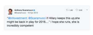 At one point, it looks like Scaramucci was a fan of Hillary Clinton — just like President Trump — having tweeted five years ago he “hope she runs, she is incredibly competent.” This tweet has also been conspicuously disappeared.