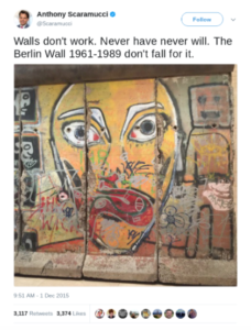 The former financier and Fox Business host said on Friday “I love the president and I’m very, very loyal to the president, and I love the mission that the president has.” But he’s, apparently, not a fan of Trump’s proposed wall along the Mexican border. He scrambled to delete a December 2015 tweet saying “Walls don’t work. Never have never will. The Berlin Wall 1961-1989 don’t fall for it.”