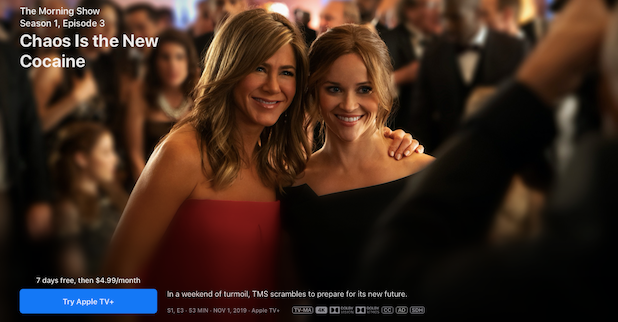 As you can see in the screengrabs below, a user is given the ability to play the first and second episode of Jennifer Aniston and Reese Witherspoon’s “Morning Show,” but when you arrive at the third, you’ll be asked to “Try Apple TV+” and if you choose to do so, then a pop-up will ask you to initiate your week-long free trial.