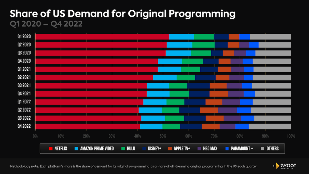 However, in examining U.S. audience demand for original programming across streaming services, Parrot found that Apple TV+ originals accounted for 6.4% of total demand in the fourth quarter of 2022, compared to Netflix’s 39.6%, Amazon Prime Video’s 11.1% and Disney’s 10.2%. Apple TV+’s share has grown since the first quarter of 2020, but is down from its 7.1% peak in the fourth quarter of 2021, shortly after the release of “CODA.”