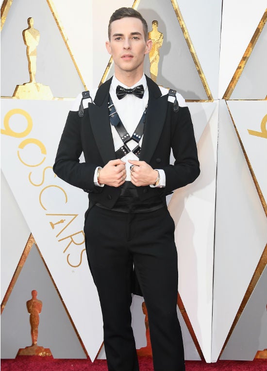 Adam Rippon upgraded his black tux with a leather harness and shoulder cutouts.