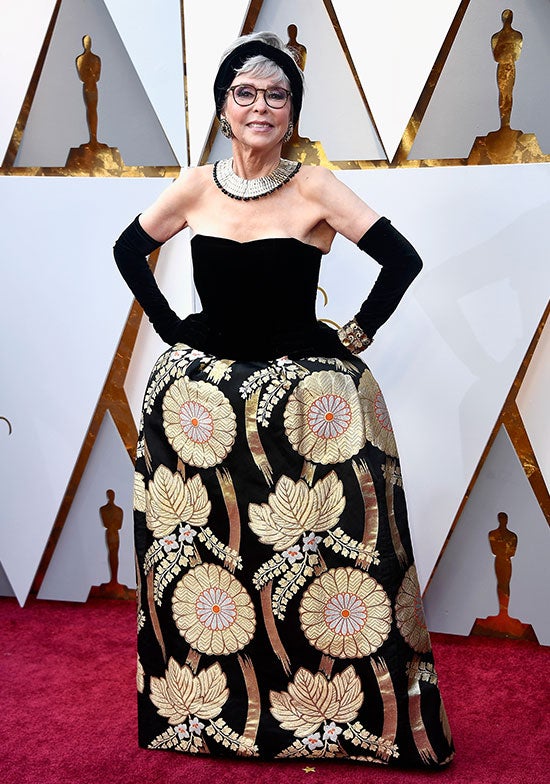 Rita Moreno took part of the dress she wore to the 1962 Oscars, where she won for her role in “West Side Story,” and matched it with a major statement necklace and a head wrap. Brilliant.