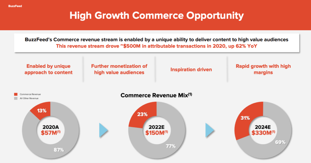 In its first quarterly earnings this week, BuzzFeed reported that commerce revenue actually fell 26% to $16.7 million in Q4 — generally the biggest quarter especially for commerce companies. And the company has removed last year’s pitch deck from its investor relations site — the one where it projected $117 million in profit by the end of 2022, mostly from e-commerce, and targeted e-commerce revenue to hit $330 million by 2024. Worse, it’s declined to provide any updated estimates.