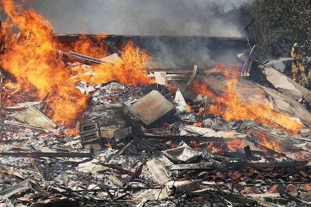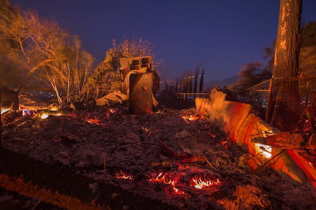 Strong wind blows embers from the smoldering ruins of a house at the Creek Fire on Dec. 5, 2017 in Sunland.
