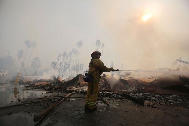 A firefighter sprays water on the remains of a home destroyed by the Thomas Fire in a residential neighborhood on Dec. 5, 2017 in Ventura, CA.