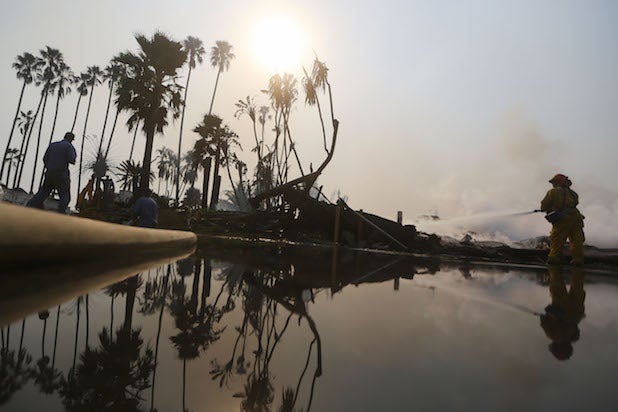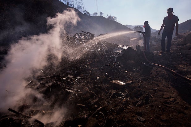 Ranch hands Angel Flores and Anthony Martin (R) hose down smoldering property near stables at Rancho Padilla on Dec. 6, 2017 near Sylmar, CA.