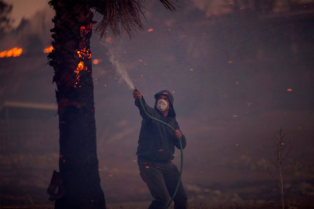 A resident hoses down a burning structure in Sunland, CA during the Creek Fire on Dec. 5, 2017.