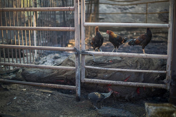 Ranch hand Anthony Martin hoses down stalls where some of the 29 horses and numerous other animals had died in the Creek Fire at Rancho Padilla on Dec. 6, 2017 near Sylmar, CA.