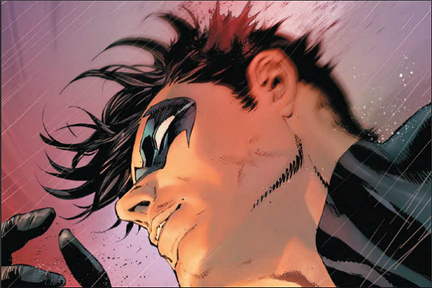 So Did Dick Grayson die from that headshot? It doesn’t seem like it. Solicitations (that’s the industry term for text accompanying retailer previews that summarize an issue’s plot) for upcoming issues of the ongoing “Nightwing” comic series seems to spoil the fact that Grayson survives, but suffers from amnesia as a result of brain damage from the shot.