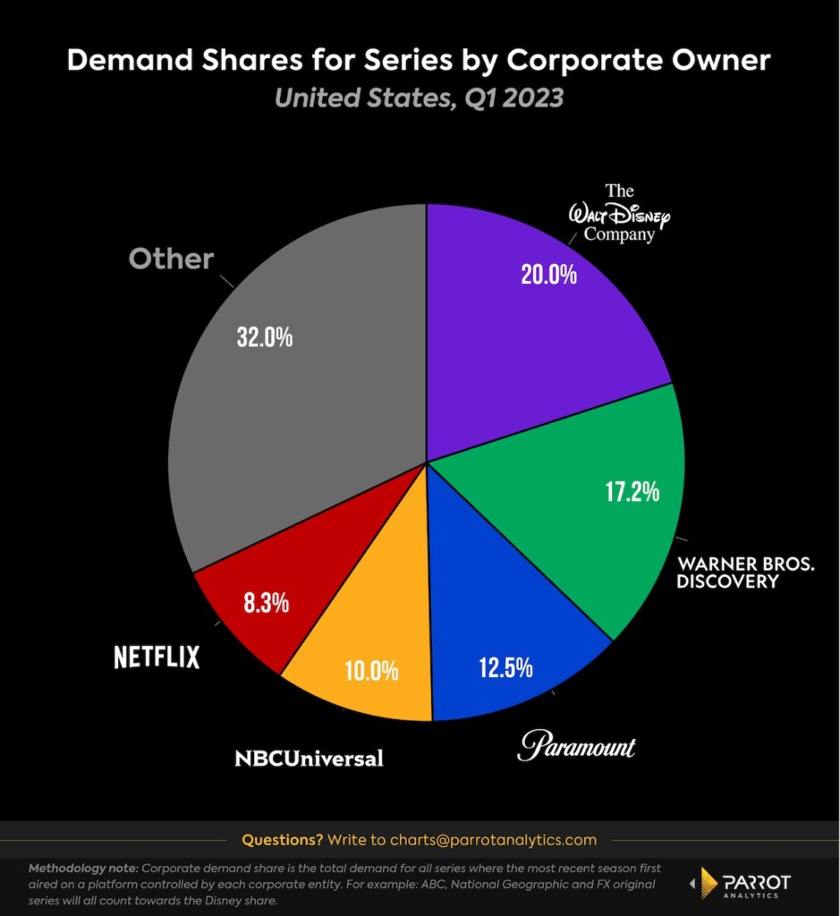 Disney remains the leader at the corporate level in terms of demand for its series, according to Parrot Analytics‘ data, which takes into account consumer research, streaming, downloads and social media, among other engagement. Corporate demand share can assess which companies have the most valuable content to exploit, either through streaming subscriptions or licensing.