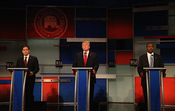 MILWAUKEE, WI - NOVEMBER 10: Presidential candidates Sen. Marco Rubio (R-FL), Donald Trump, and Ben Carson take the stage at the start of the Republican Presidential Debate sponsored by Fox Business and the Wall Street Journal at the Milwaukee Theatre November 10, 2015 in Milwaukee, Wisconsin. The fourth Republican debate is held in two parts, one main debate for the top eight candidates, and another for four other candidates lower in the current polls. (Photo by Scott Olson/Getty Images)
