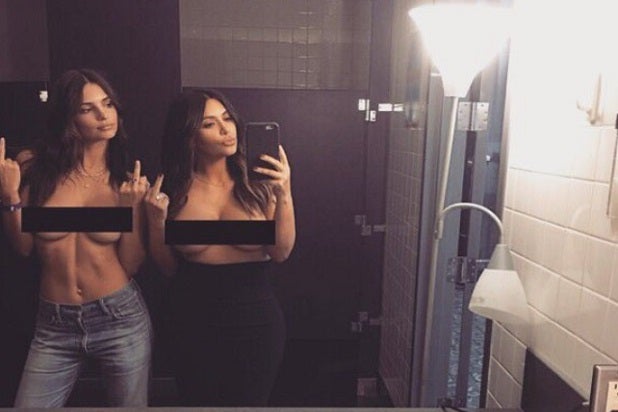 The Bare Facts: In a show of naked sisterhood with Kim Kardashian, Ratajkowski posed for a topless selfie with the reality TV queen in March, featuring both women sans blouses and flipping the bird.