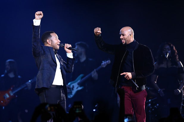 After the guests at Santa Monica’s Barker Hangar were suitably lubricated on Moet Hennessy, Legend and Common took to the stage (and the piano) to perform their Oscar-winning song “Glory” from 2015’s “Selma.”