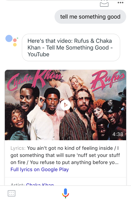 Looking to start our day on a positive note, TheWrap tried out the new feature, asking the Google Assistant app on iPhone to “tell me something good.” The feature doesn’t appear up and running just yet, though. Instead of recommending news stories, Google shared the 1974 hit “Tell Me Something Good,” by Rufus and Chaka Khan. Several other attempts failed as well.