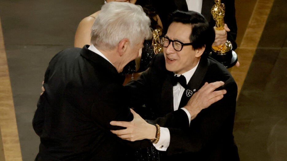 Harrison Ford and Ke Huy Quan, who starred together in 1984’s “Indiana Jones and the Temple of Doom,” melted hearts on social media on Sunday night when the pair hugged on stage after “Everything Everywhere All At Once” won Best Picture. Earlier in the night, Quan won the Best Supporting Actor Oscar.