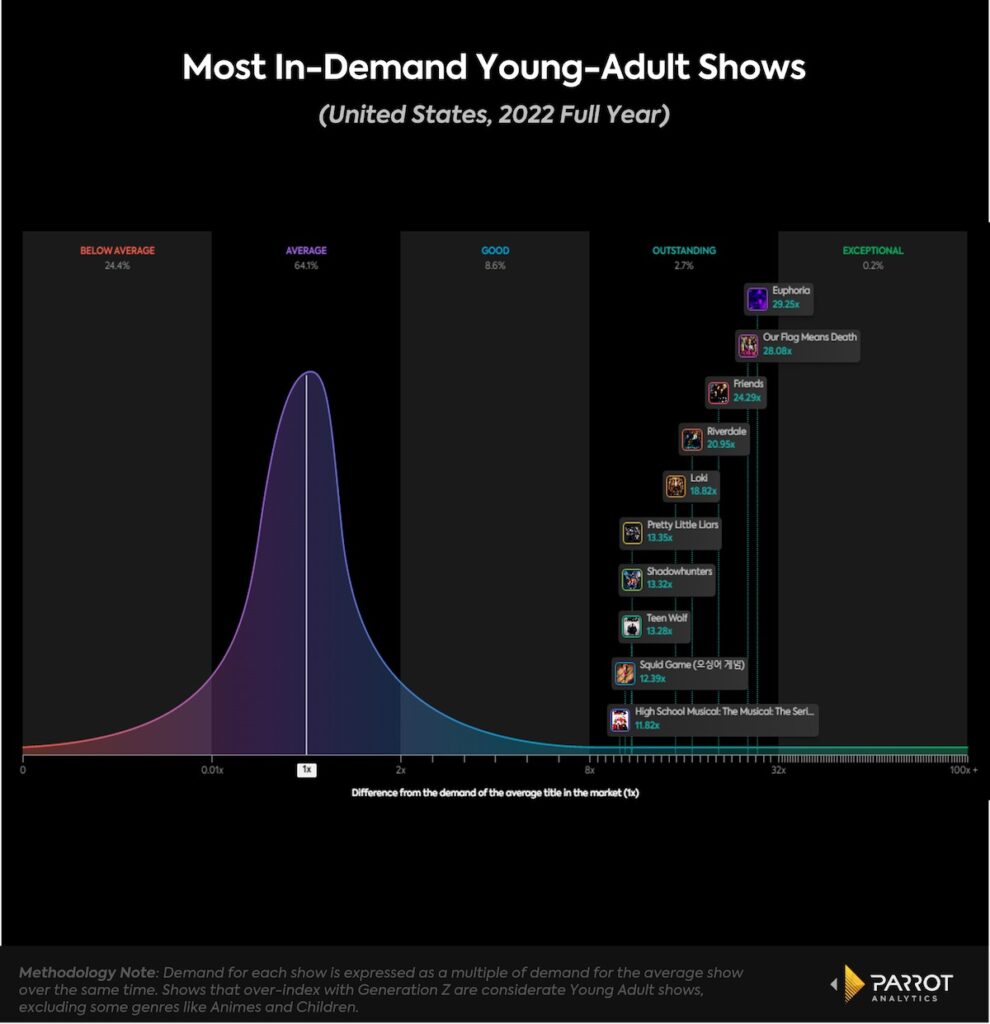 In 2022, HBO Max had the top three YA shows: “Euphoria,” with 29 times more demand than the average show in the U.S. market, followed by “Our Flag Means Death” and legacy title “Friends.”