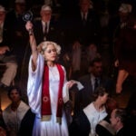 “The two things that had really stuck out to me about Aimee was that a lot of her gowns for the stage were made by people who did costumes in Hollywood,” Potter said. “So that’s why when you look at them, they really do look like these beautiful, luxurious, glowing silk gowns. There’s a sexuality and a power to Sister Alice on the stage, so we played with fluid, figure-hugging shapes. And then the other idea was that she felt kind of childlike in life – and to then have these soft, floral, delicate, silky prints when she’s alone.”