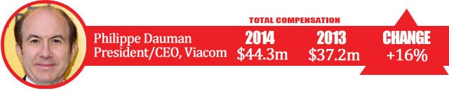 Viacom President and CEO Philippe Dauman is always well compensated — even when the company is in the midst of downsizing. Dauman hauled in $44.3 million in 2014, up more than $7 million from the prior year. The top executive can credit his extra cash this past year to over $2 million more in stock awards than 2013, $1.5 million extra in options and $3.1 million more in an incentive bonus, among other year-over-year increases. All told, Dauman was up 16 percent year-over-year, and those big bucks should continue rolling in for Dauman, as he re-upped his Viacom contract through 2018.