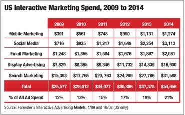 A five-year forecast released last week by Forrester Research predicts continued growth in interactive marketing, a figure that will approach $55 billion and account for 21% of all marketing spend come 2014.