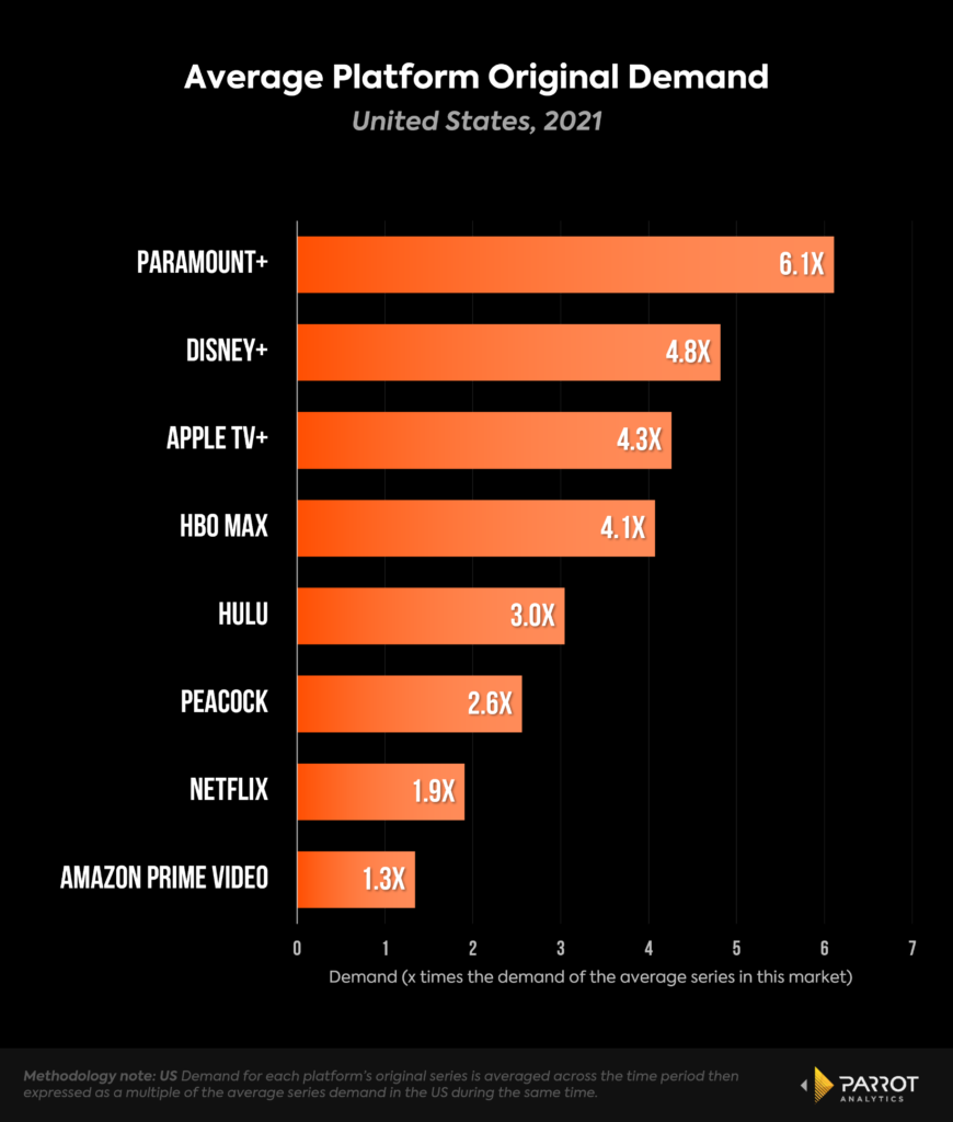 In the U.S. in 2021, Paramount series had 13.4% of the total demand for its original series, second only to Disney with 20.1%. This also puts it ahead of fellow legacy media brands WarnerMedia (11.9%) and NBCUniversal (10.8%) for the year.