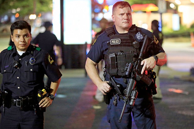 Snipers aiming at police officers, killing five, wounding another six officers and one civilian. One of the snipers got into a shootout with SWAT officers.