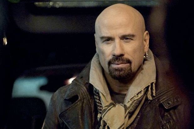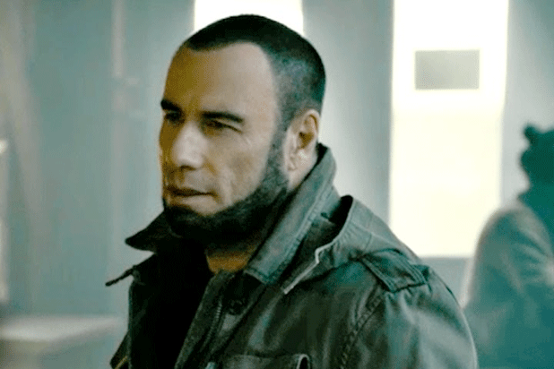 Playing a Serbian soldier hunting down American vet Robert De Niro, Travolta sports an unusual look that suggests Abraham Lincoln after a razor attack.