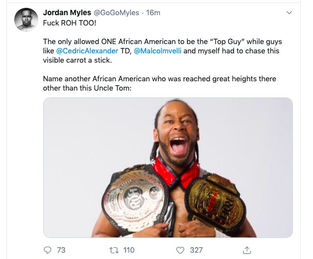 Myles also called Ring of Honor wrestler Jay Lethal an “Uncle Tom,” and criticized the WWE for employing Hulk Hogan after using the n-word. “The fact that @HulkHogan is still employed after giving the locker room an apology for being caught says enough,” Myles wrote.