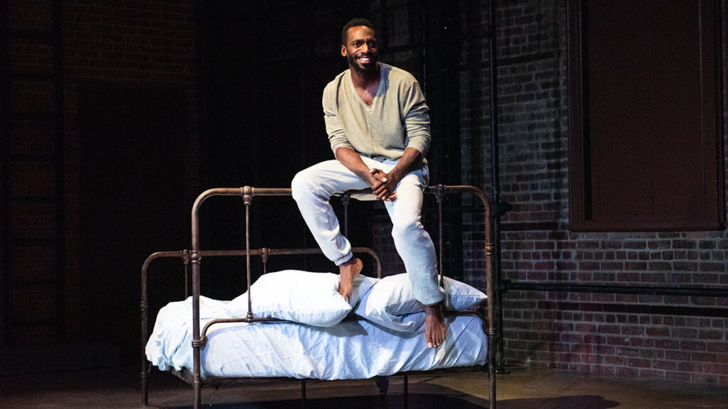 But while you may be expecting in the second half of the show to hear from the man in the relationship, a she-said-he-said call-and-response on modern love, Anyanwu the playwright subverts our expectations with a second section that veers into either sci-fi or allegory. The tight apartment peels away to the Atlantic’s full stage, with the bed off to one side, a urinal on the left stage wall and the suggestion that we are either in a prison or a mental ward. (In Yu-Hsuan Chen’s spare set design, this cell occupies easily nine times the space of the woman’s apartment — a curious choice since a more claustrophobic setting might have better suited the monologue that is to come.)