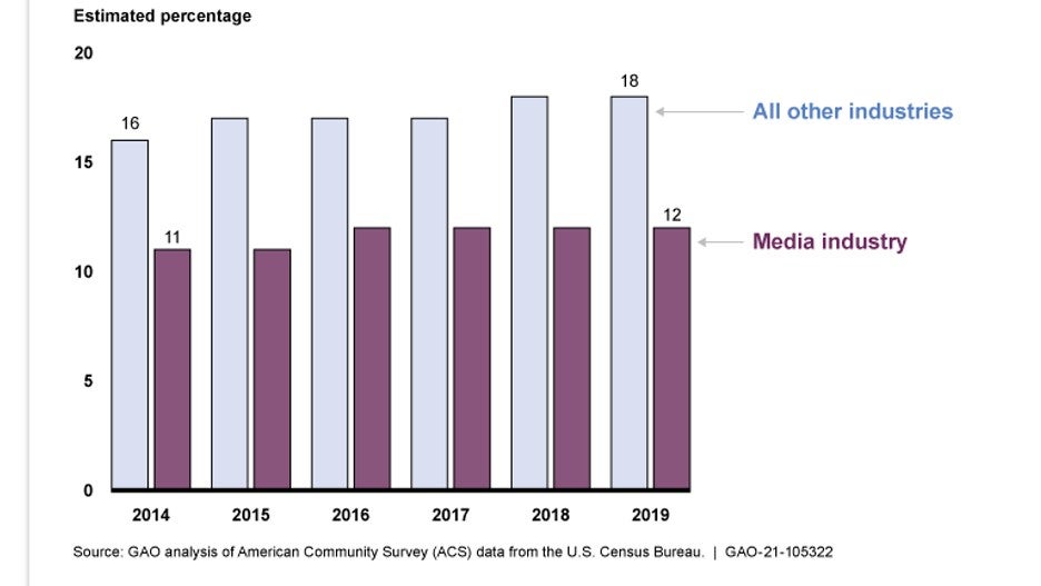 The new study, published by the U.S. Government Accountability Office, defined media to include film, television, publishing and news. Employment varied widely between sectors of media; 8% of publishing subsector workers were Latino in 2019, while the film and video industry totaled 16%.
