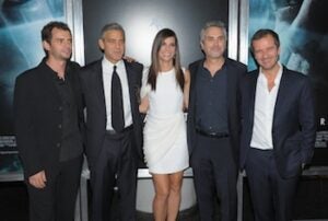 (From left: Jonas Cuaron, George Clooney, Sandra Bullock, Alfonso Cuaron and David Heyman at the New York premiere of “Gravity.”)