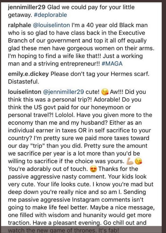 “Have you given more to the economy than me andmy [sic] husband? Either as an individual earner in taxes OR in self sacrifice [sic] to your country? I’m pretty sure we paid more taxes toward our ‘trip’ than you did,” she wrote.