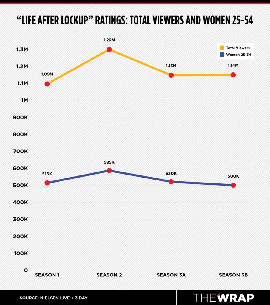 The current “Love After Lockup” season is the No. 1 cable original program on Fridays among women in both the 18-49 and 25-54 demos. WE tv mostly sells ads based on the women 25-54 demo.