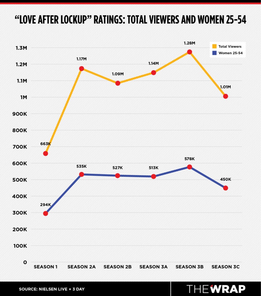 From the seven-episode Season 1 to the 14-episode start to Season 2 (dubbed 2A), “Love After Lockup’s” overall audience soared 77%, from an average of 663,000 viewers per episode to 1.174 million, according to Nielsen’s Live + 3 Day data. The franchise has been a pretty steady performer since then, which makes it an outlier — in a good way — in the current TV-viewing landscape where most shows see a steady erosion of audience over time.