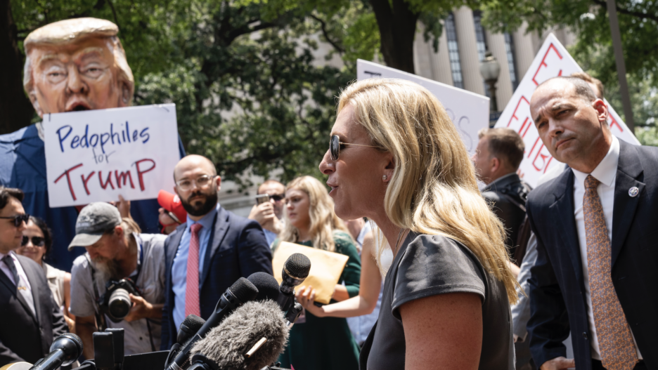 A news conference run by Republican U.S. representatives Matt Gaetz (Florida) and Marjorie Taylor Greene (Georgia) was interrupted by protesters and eventually cancelled entirely Tuesday.