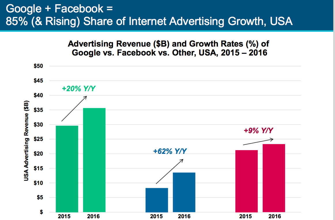 The dependence on social media has put many outlets in a bind, David Cohn, Senior Director at Advanced Publications, told TheWrap. Media sites can’t ignore Facebook; they need to leverage the social network’s massive platform to funnel readers towards its content. But the money they’re making, in comparison to the gargantuan ad sales Facebook and Google rake in, is negligible. (The duopoly accounts for 85 percent of all internet ad growth, and combined will make more than $100 billion in ad revenue in 2017, according to Mary Meeker’s annual report.)