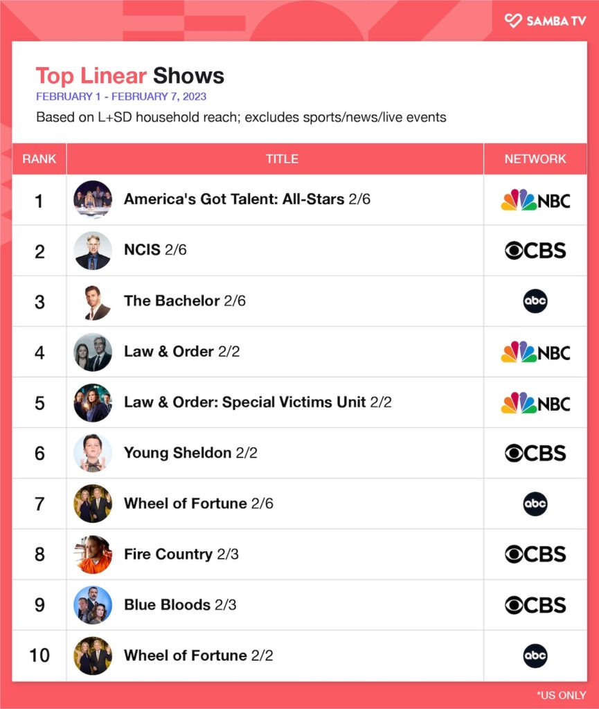 On linear television, CBS notched the most spots, while Fox was the only major broadcast network absent from the leaderboard. NBC reigned on top, with an episode of “America’s Got Talent All-Stars,” followed by “NCIS” on CBS, and ABC’s “The Bachelor.” Two telecasts of “Law & Order” (NBC) and “Wheel of Fortune” (ABC) each nabbed slots, with dramas continuing to dominate over comedy.