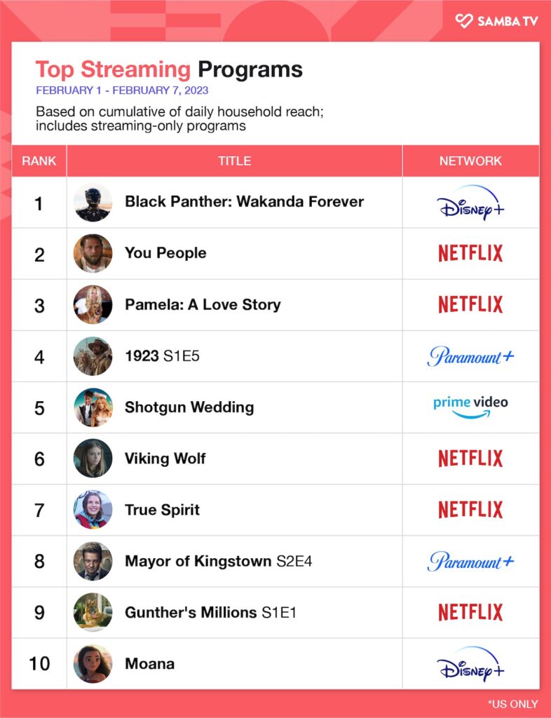 Disney’s Marvel franchise also continues to deliver on streaming with “Black Panther: Wakanda Forever” landing atop the streaming charts, with over 2 million U.S. households tuning into the much-anticipated sequel on Disney+ in its first five days, according to the report, which uses TV viewership trends analyzed from Samba TV’s household panel of over 25 million connected TVs, including both linear and streaming consumption.