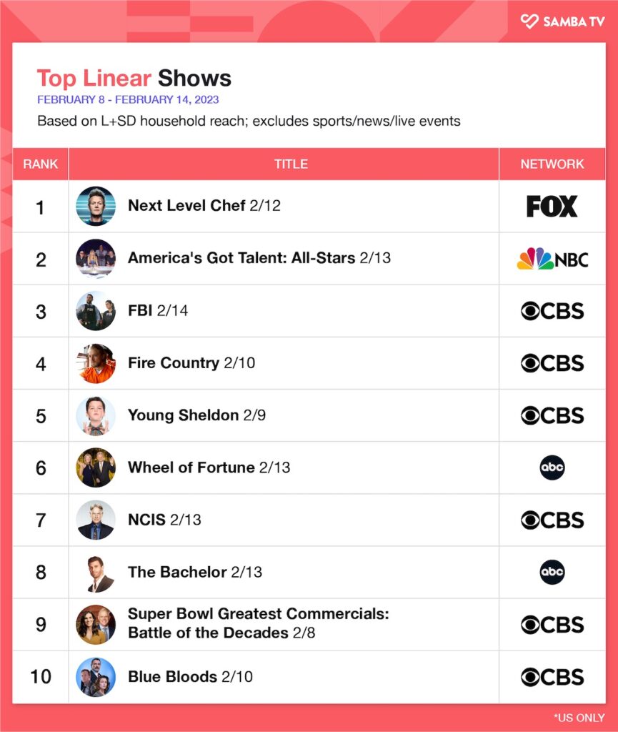 With a lead in from Fox’s Super Bowl broadcast of Super Bowl LVII, “Next Level Chef” got a major lift and was the top-rated program on linear television last week. (Wrap Report rankings don’t include news, sports or live events.) CBS’ interactive special “Super Bowl Greatest Commercials: Battle of the Decades,” which highlighted the top commercials of the last four decades, also claimed a spot on the charts. A Samba TV analysis of this year’s Super Bowl commercials showed the heartwarming “Farmer’s Dog” 60-second spot rise to become the most-viewed brand advertisement of the game.