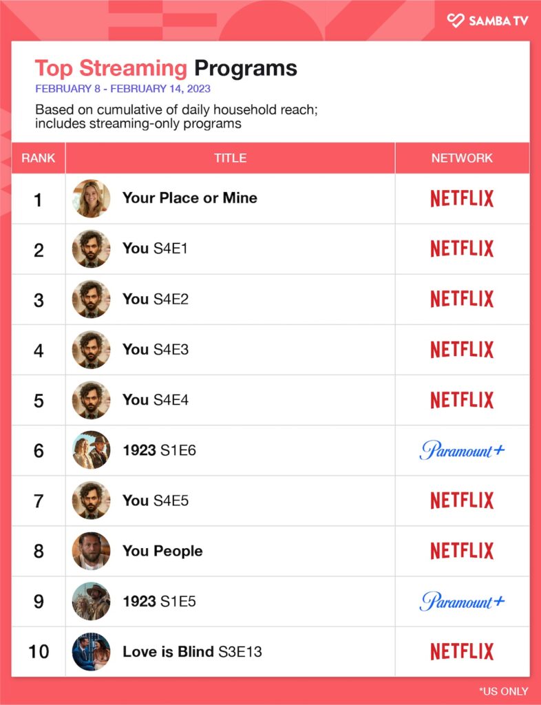 Perhaps the lead up-to Valentine’s Day had romance on viewers’ minds, with content ranging from chart-topping Netflix original movie “Your Place or Mine” to reality series “Love is Blind” to a linear classic like “The Bachelor” all delivering heart-warming viewership.