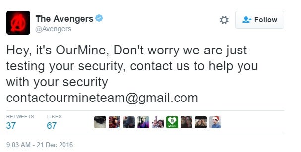 OurMine, which has previously targeted Facebook CEO Mark Zuckerberg, Twitter co-founder Jack Dorsey and Google CEO Sundar Pichai among others in the tech sector, is believed to have hacked the accounts, which included the @Netflix and @Avengers. The hackers posted a message that read, “Hey, it’s OurMine, Don’t worry we are just testing your security, contact us to tell you more about that.”