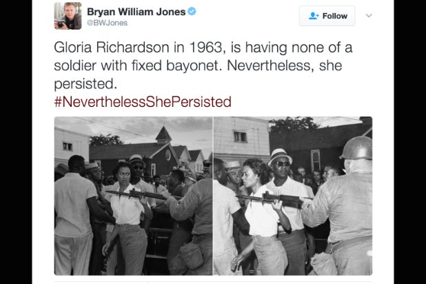 This is Gloria Richardson, the leader of the Cambridge Movement (a civil rights movement in Cambridge, Maryland). It is captioned: “Gloria Richardson in 1963, is having none of a soldier with fixed bayonet. Nevertheless, she persisted.”