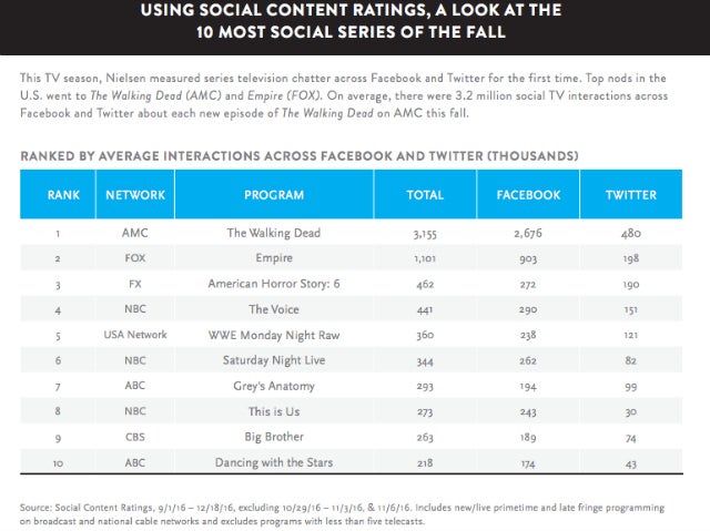 No surprise here, “The Walking Dead” was the granddaddy of them all, compiling a rounded 3.2 million combined Facebook and Twitter interactions per episode. Fox’s “Empire” was a very distant second with 1.1 million, though the broadcast leader still finished pretty far ahead of bronze medalist, “American Horror Story” (462,000).